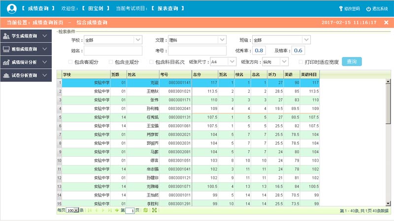 可以查询出此系统中学生历次考试的所有科目的成绩信息,详细到学生的客观、主观、总分,客观题选项信息,主观题每个题目的分数、试卷图片及教师批注、评语信息等。