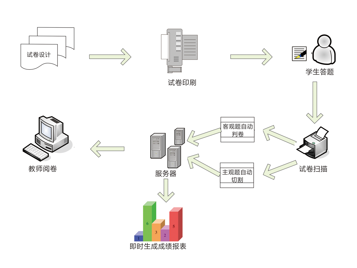 扫描识别—〉上传试卷—〉教师阅卷,自动完成无需人工干预。即扫即阅支持扫描识别与教师阅卷同步操作。