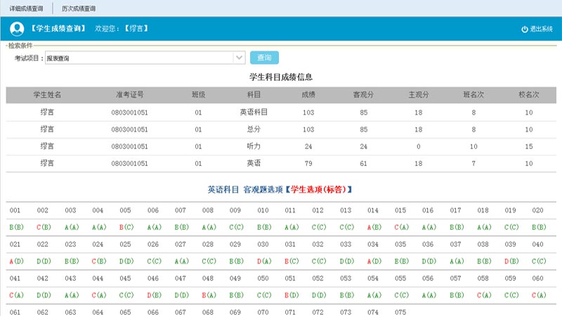可以查询出此系统中学生历次考试的所有科目的成绩信息,详细到学生的客观、主观、总分,客观题选项信息,主观题每个题目的分数、试卷图片及教师批注、评语信息等。